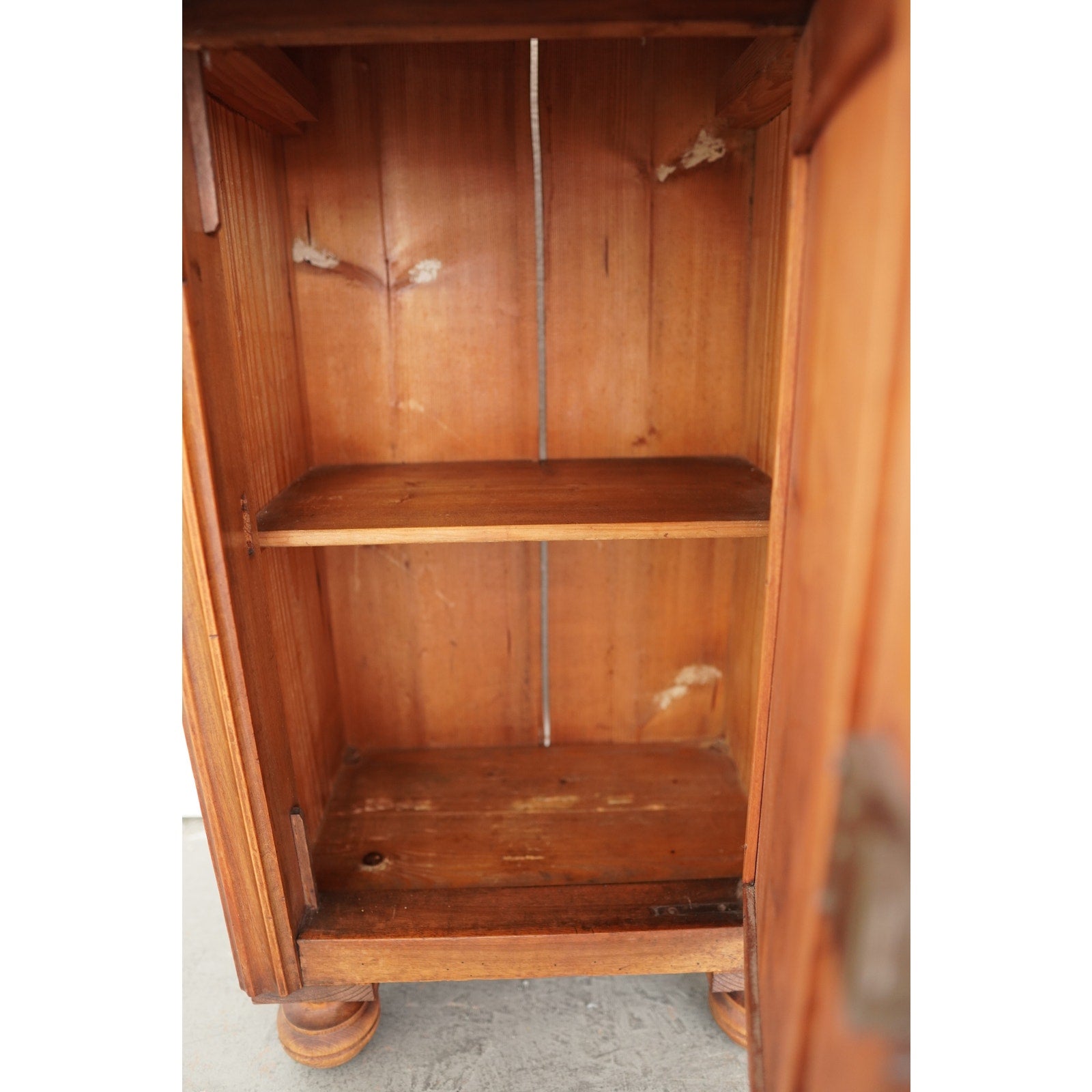 Condition: Good antique condition with expected wear consistent with age. The walnut has developed a warm patina, showing light surface marks, small scratches, and finish variations throughout. The drawer interior has notable darkening and some staining, while the interior shelf and cabinet base show age-related wear. Hardware and escutcheons appear original and display natural tarnishing. The original key is missing, though the cabinet door still opens and closes properly. The piece is structurally sound and sturdy, with wear that reflects its history and authenticity.