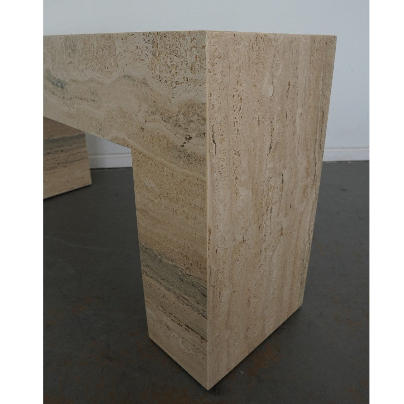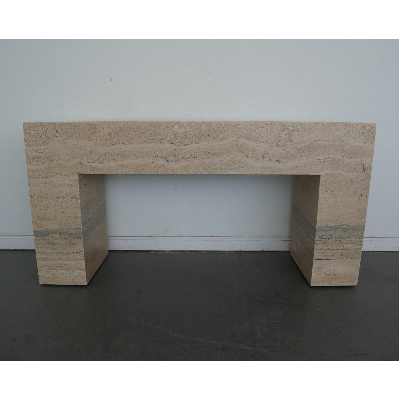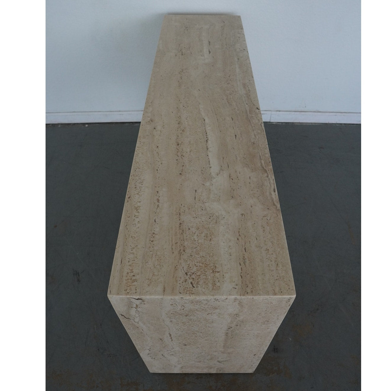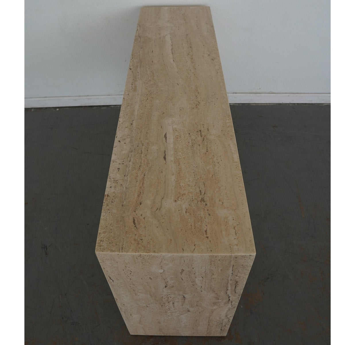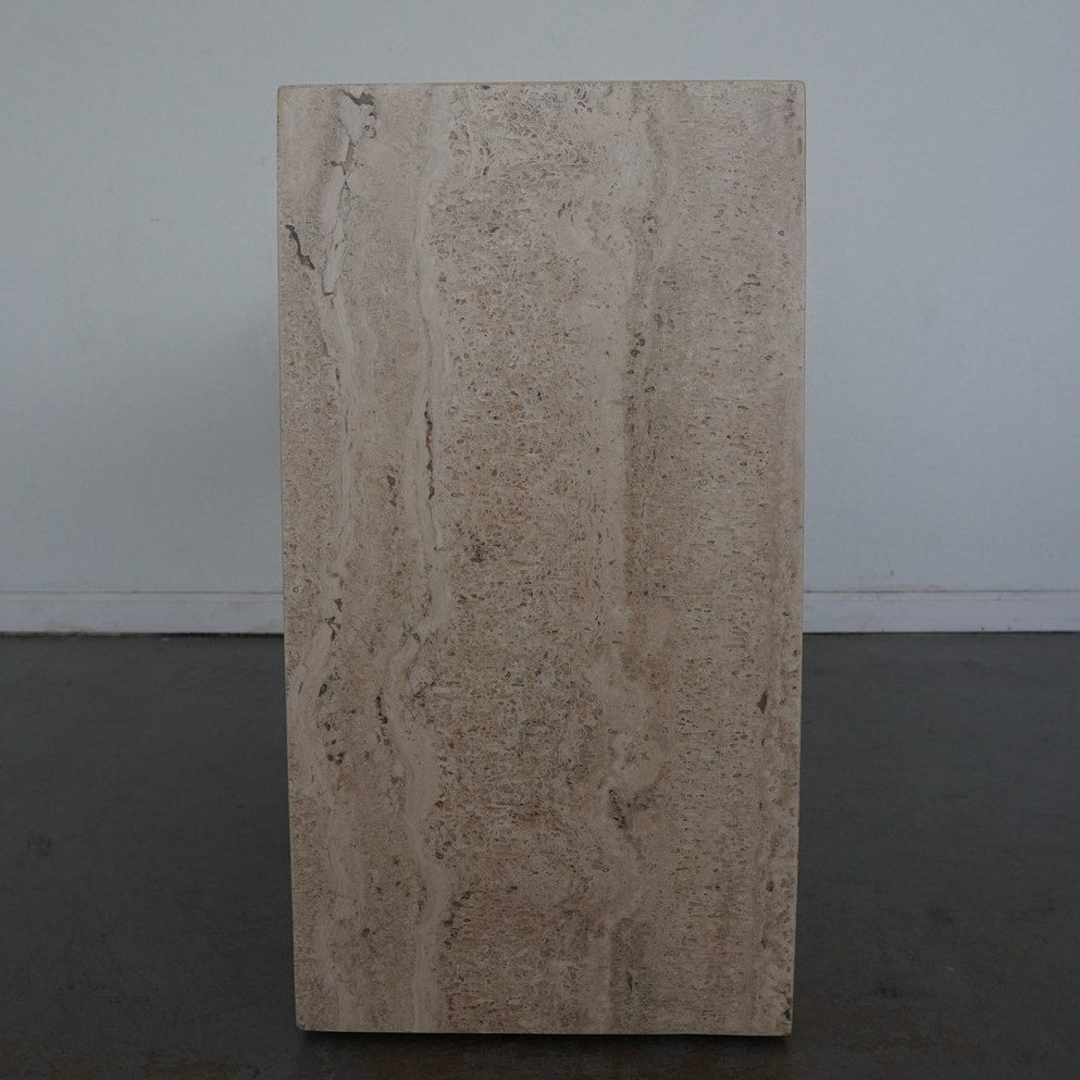 A minimalist silhouette allows the distinctive veining and timeless character of Italian travertine to take center stage in our coffee table. The elemental geometric form is handcrafted of slabs of stone then polished for a glossy finish.