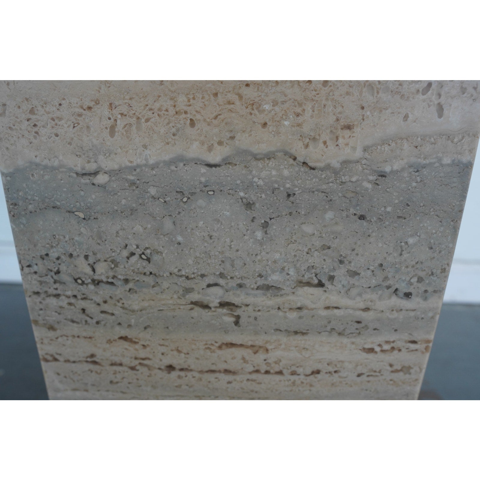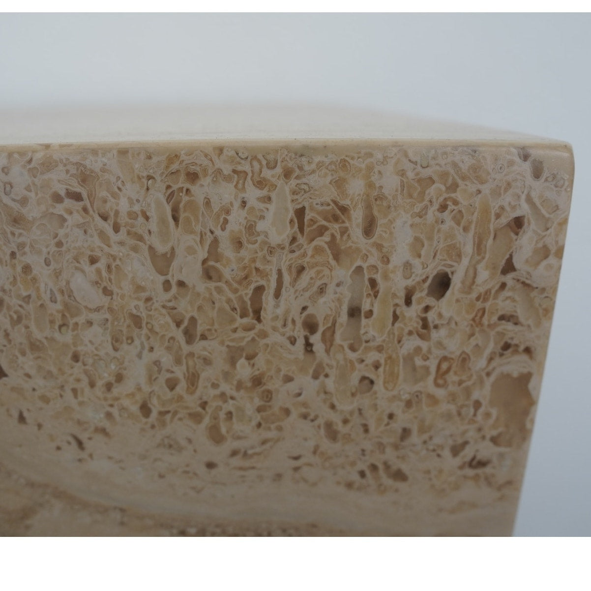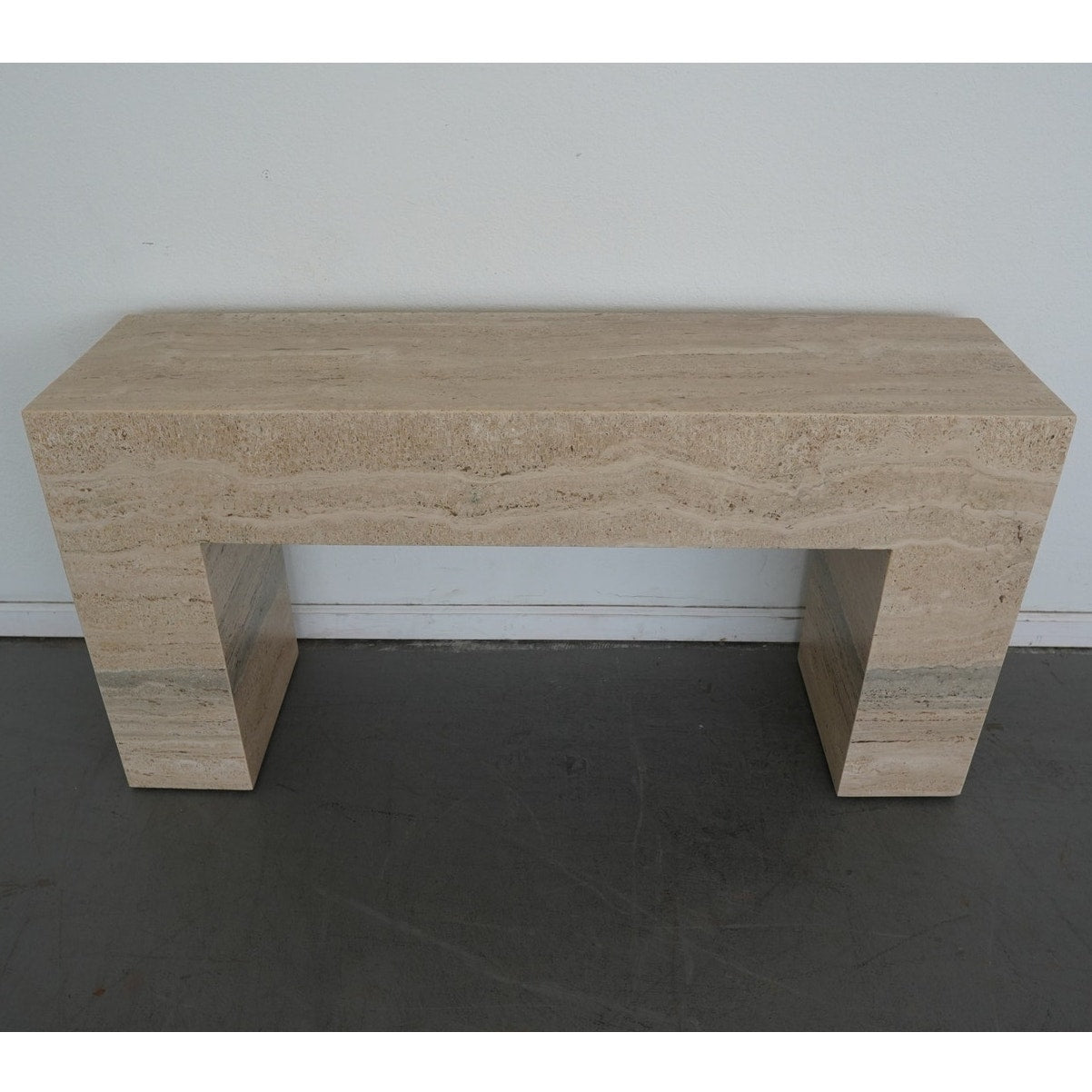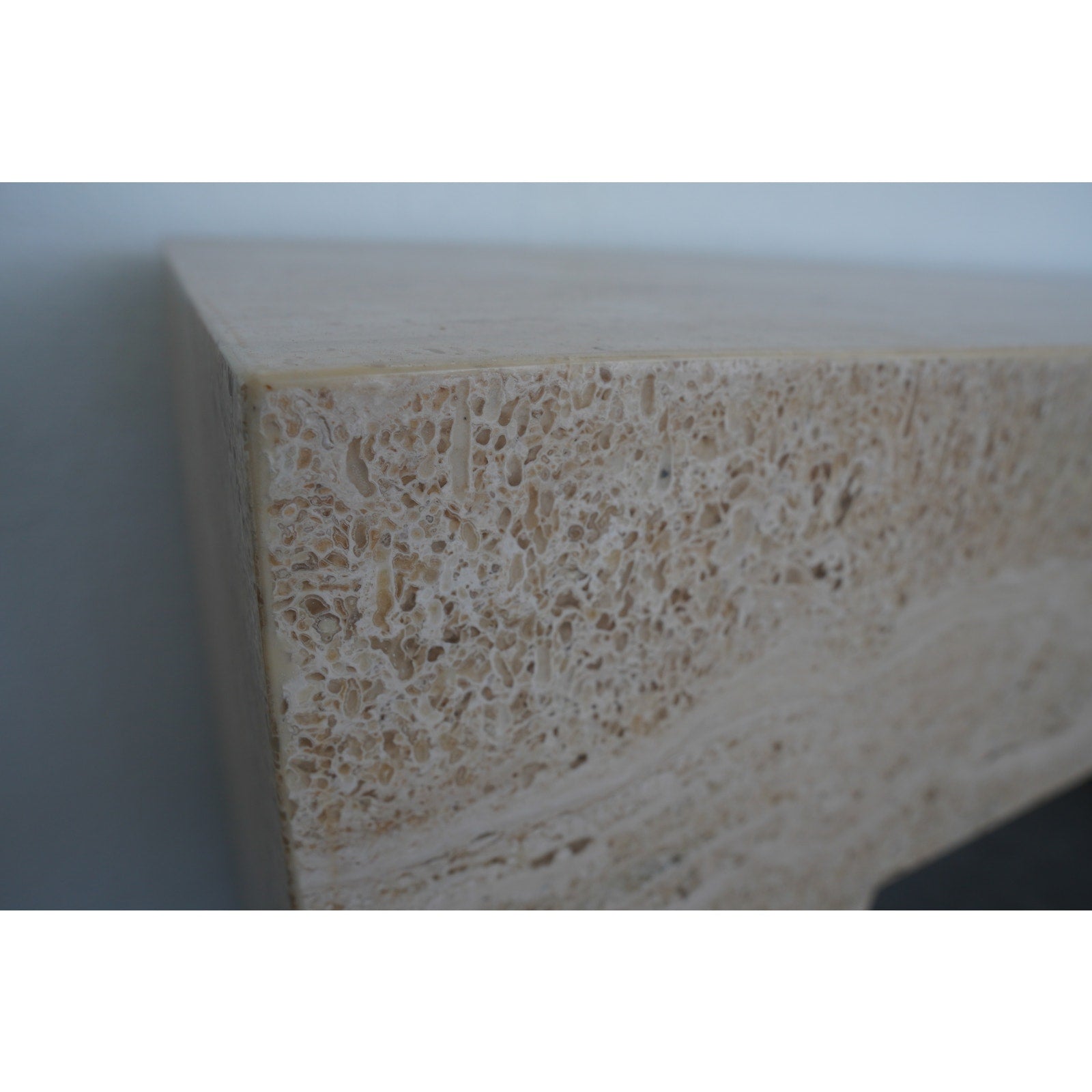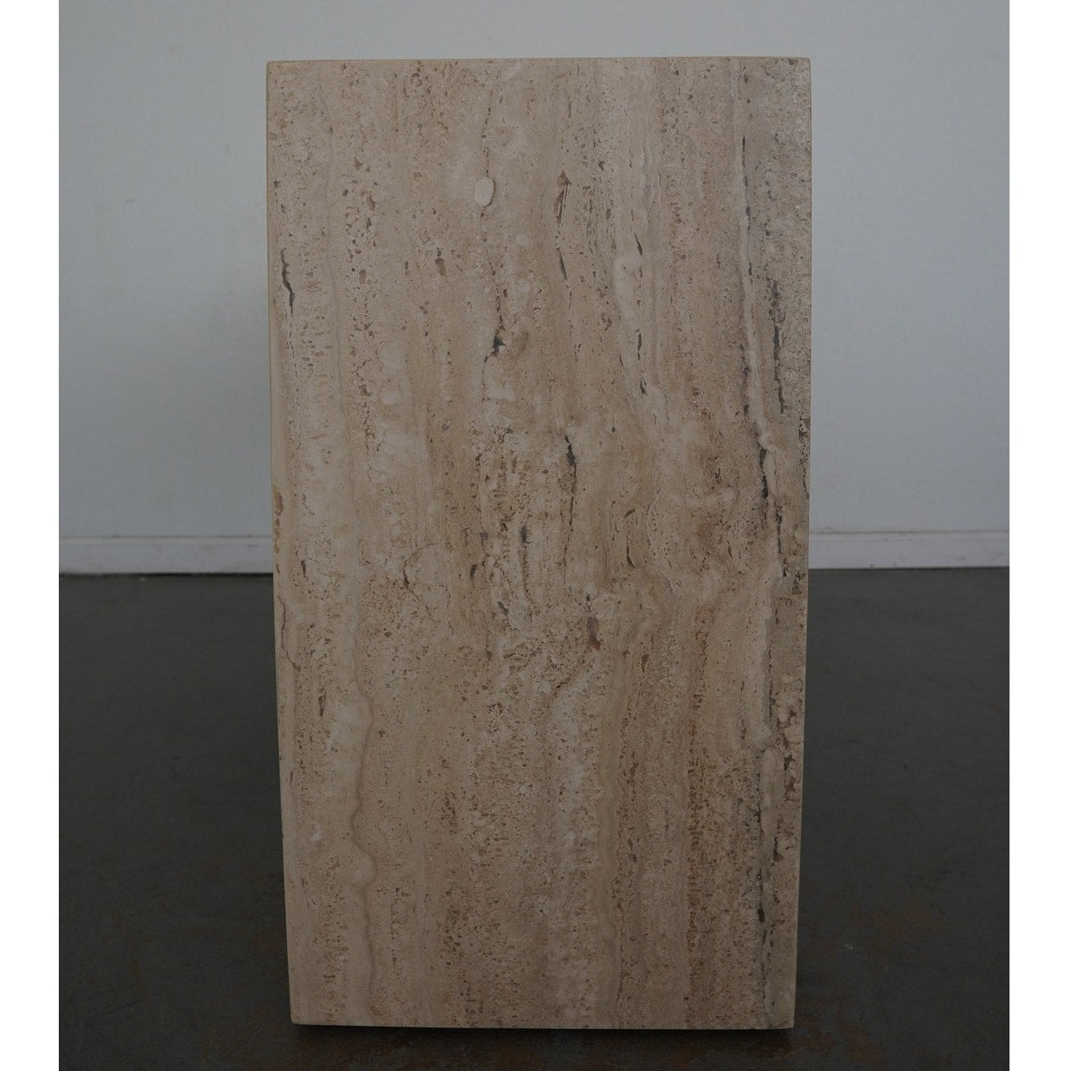 A minimalist silhouette allows the distinctive veining and timeless character of Italian travertine to take center stage in our coffee table. The elemental geometric form is handcrafted of slabs of stone then polished for a glossy finish.