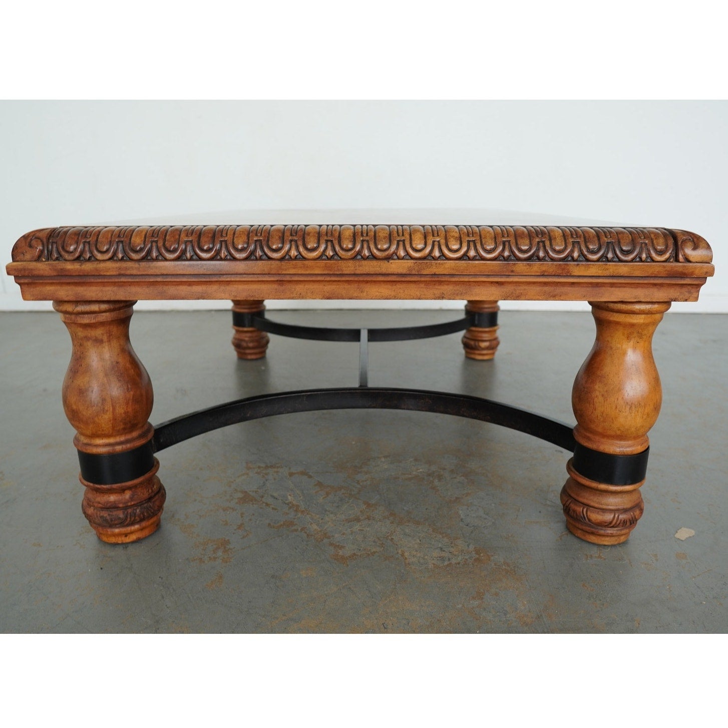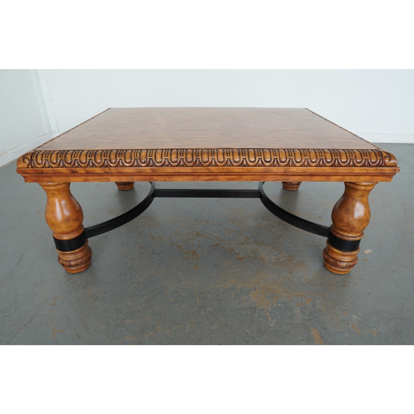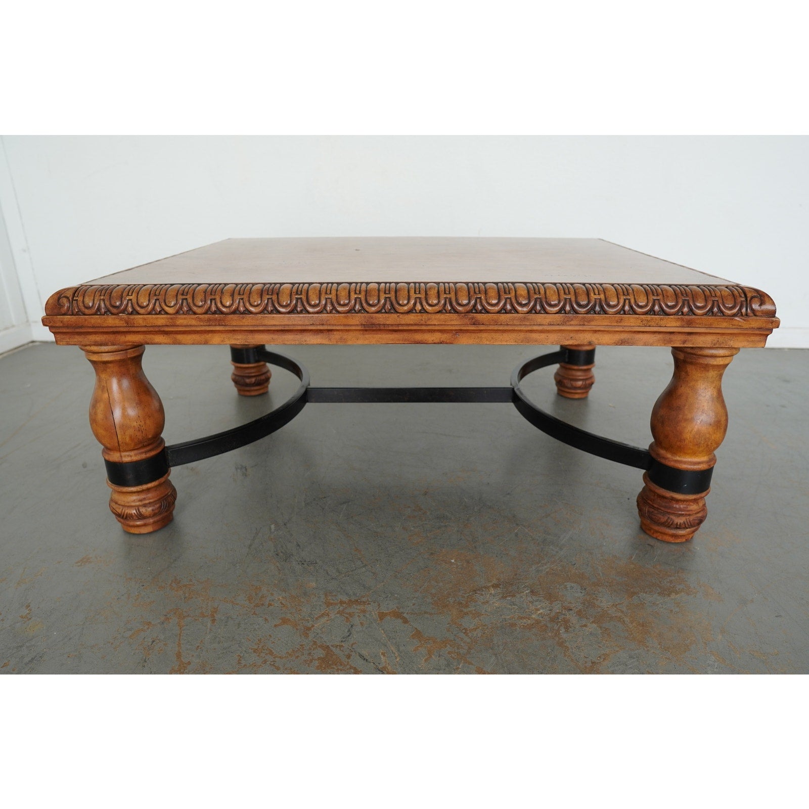 This Ethan Allen square coffee table showcases the brand’s signature craftsmanship with its richly carved apron, turned baluster legs, and decorative detailing. The warm wood finish highlights its classic design, while the contrasting black iron stretcher adds a touch of strength and balance. Perfect for traditional or transitional interiors, this piece blends elegance with durability, making it a timeless centerpiece for any living room.