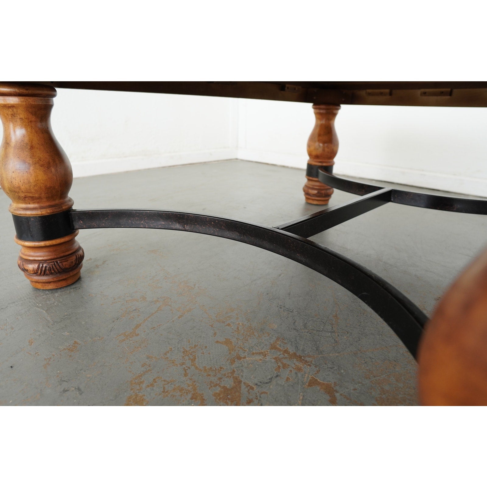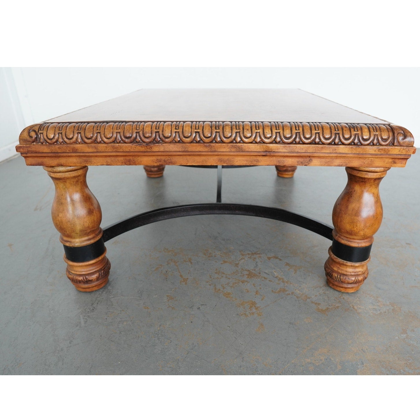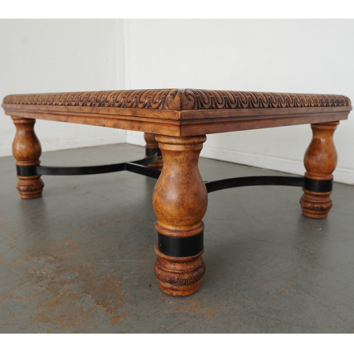 This Ethan Allen square coffee table showcases the brand’s signature craftsmanship with its richly carved apron, turned baluster legs, and decorative detailing. The warm wood finish highlights its classic design, while the contrasting black iron stretcher adds a touch of strength and balance. Perfect for traditional or transitional interiors, this piece blends elegance with durability, making it a timeless centerpiece for any living room.