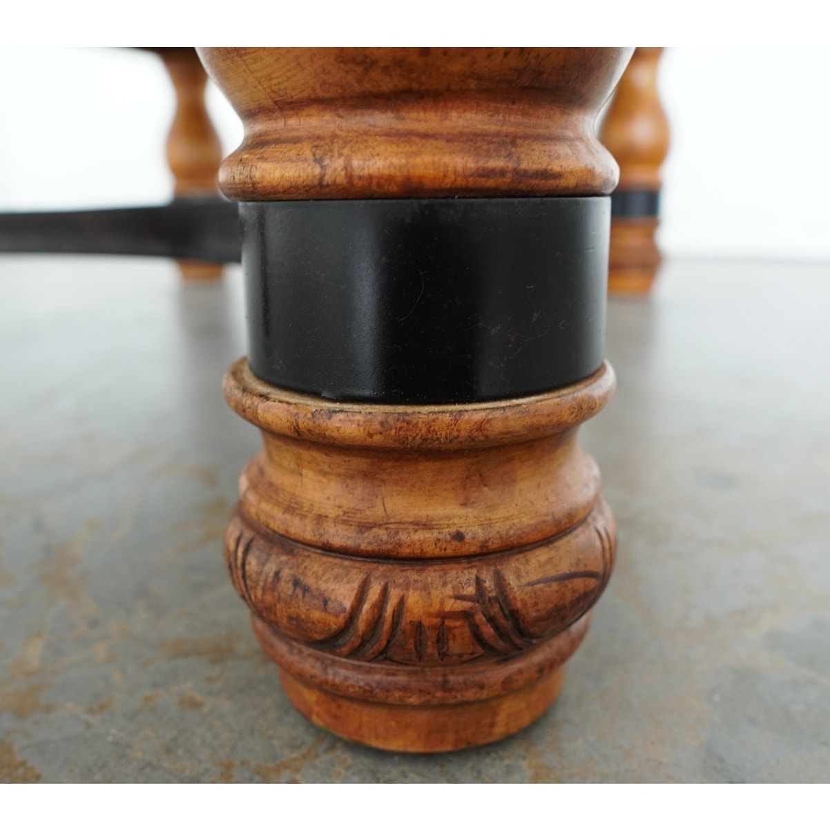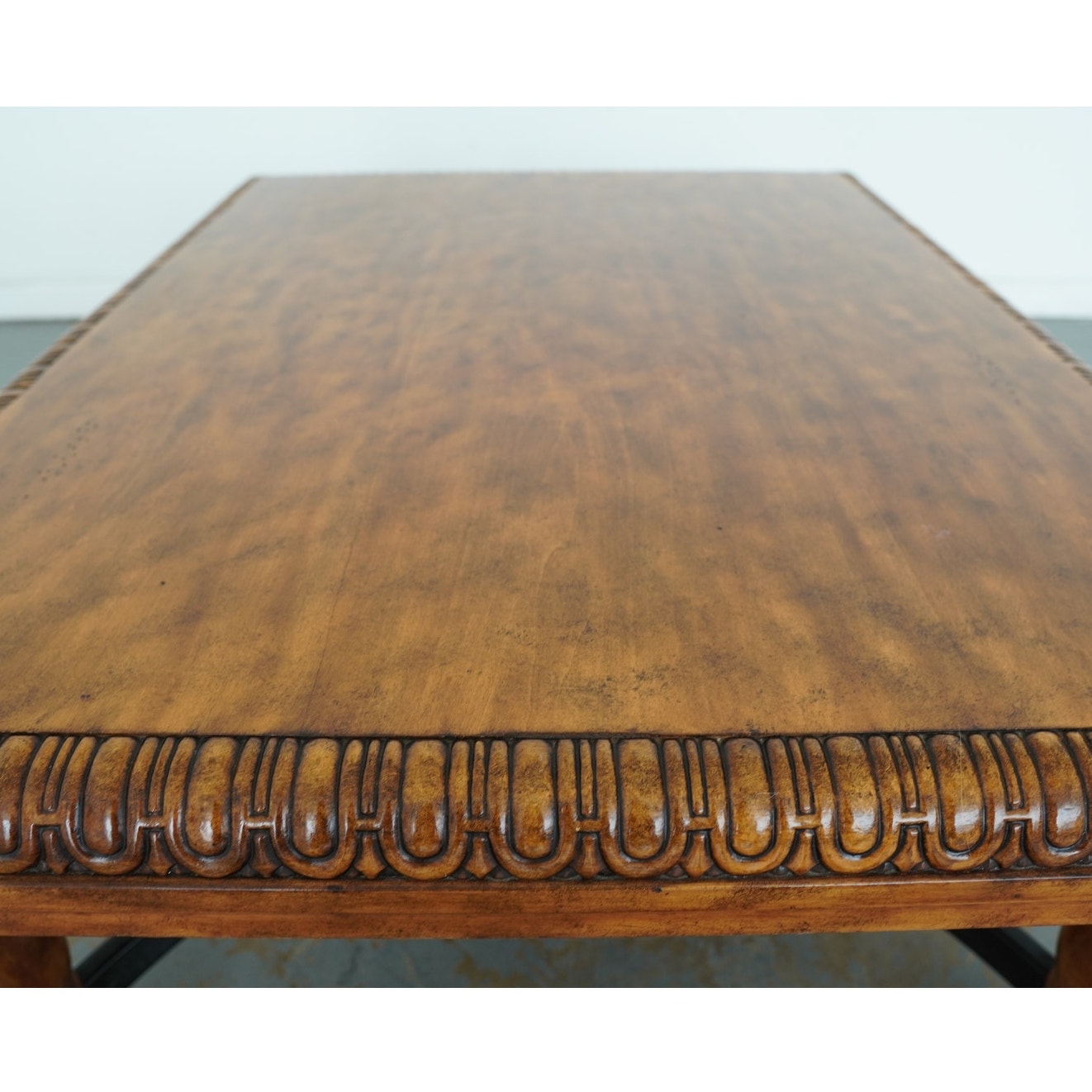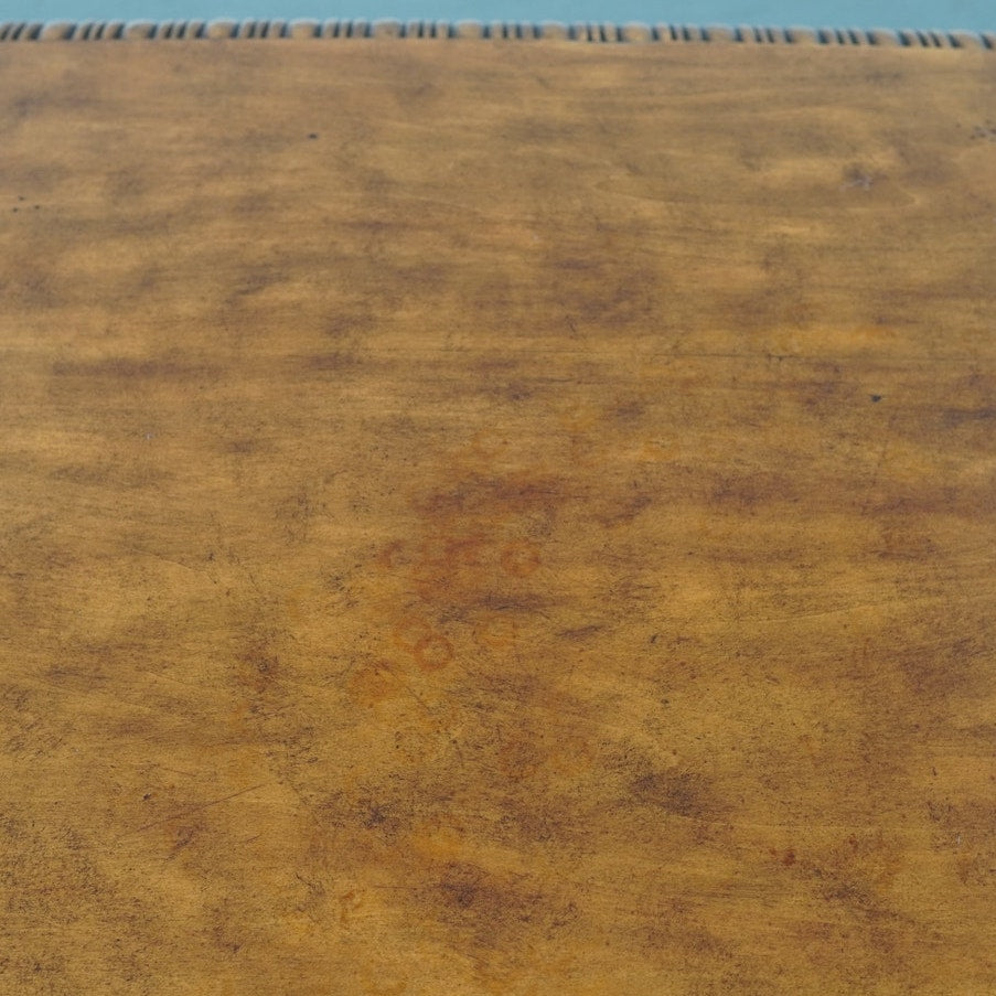 Condition: Good overall condition with age-appropriate wear. The table shows surface marks, scratches, and ring stains on the top, as well as minor finish wear along the carved edges and corners. Light scuffs are present on the legs and stretcher, consistent with normal use. Structurally solid and sturdy.