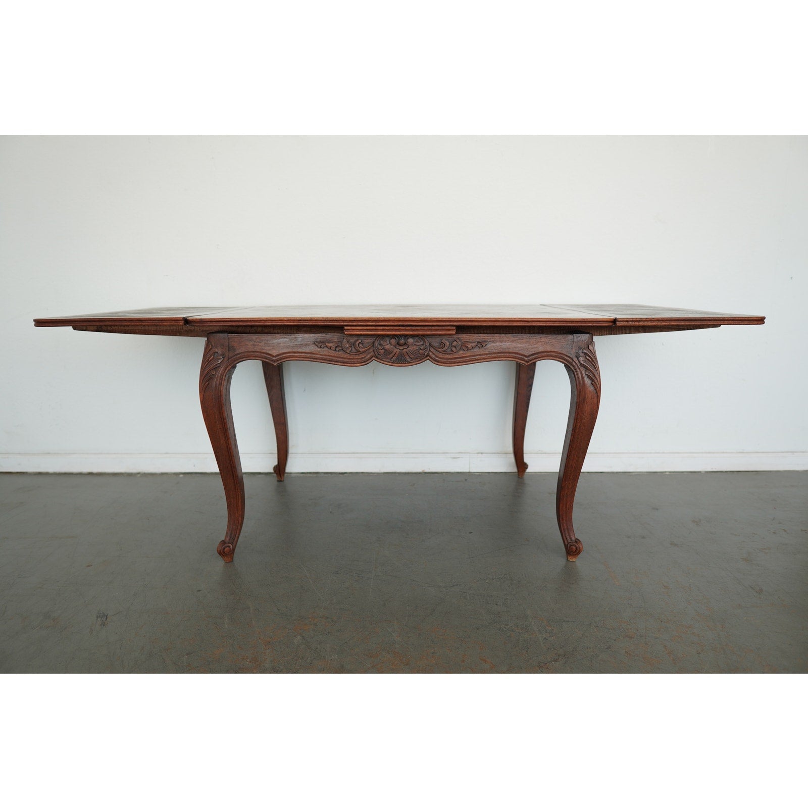This vintage French Provincial dining table, likely from the 1960s or 1970s, is a stunning example of timeless craftsmanship and European charm. It features a beautifully patterned parquet top framed by a softly contoured edge, with elegant hand-carved floral details adorning the apron and cabriole legs. The table’s rich medium walnut finish highlights the depth of the wood grain and the warmth of its patina, offering both durability and classic appeal. Designed with functionality in mind, the table includes two integrated pull-out leaves that extend smoothly from each end, allowing it to transition seamlessly from an intimate breakfast setting to a larger gathering space.