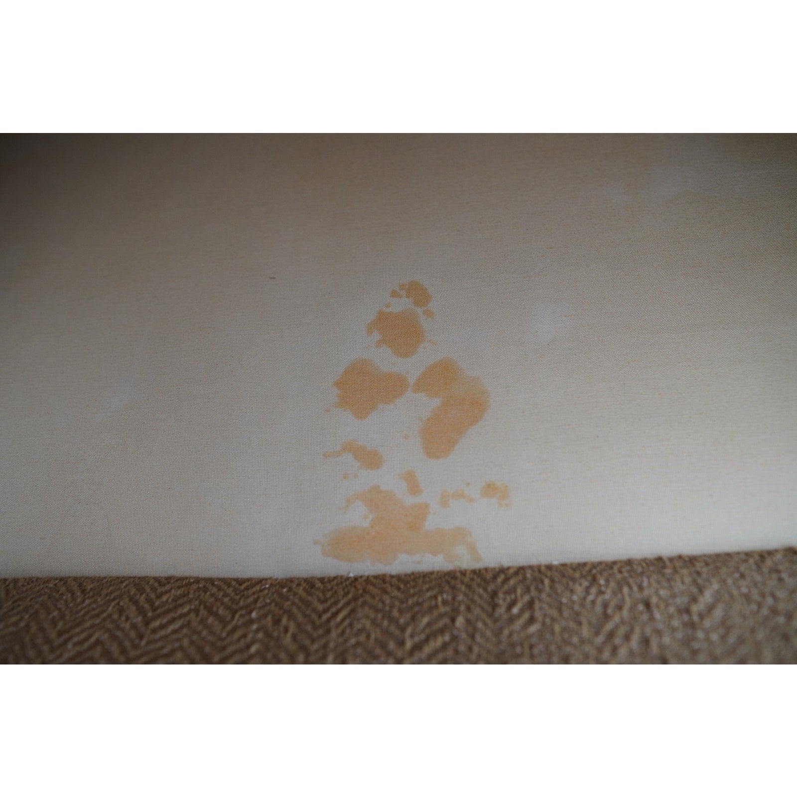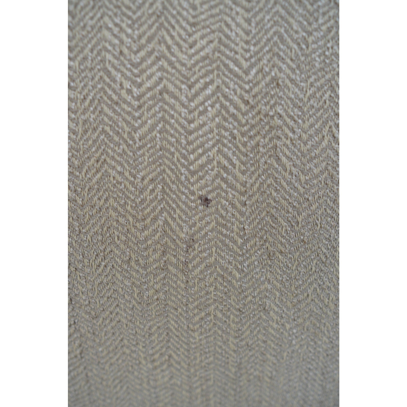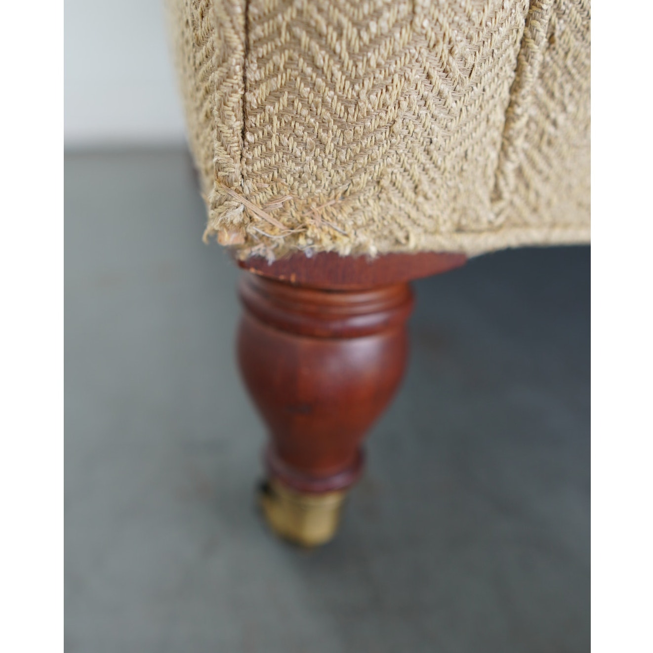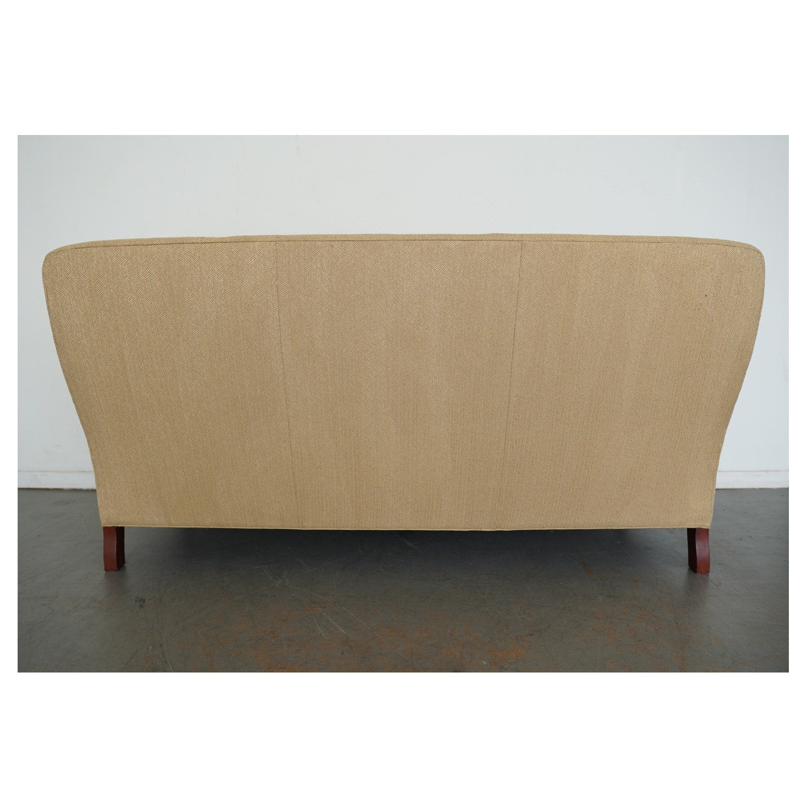 Condition: Good overall condition with wear consistent with age and use. The fabric shows some fraying at the lower front corner near one leg and a small dark mark on the upper right corner of the backrest. There is also a larger stain beneath the seat cushions that did not come out with cleaning but is not visible when the cushions are in place.