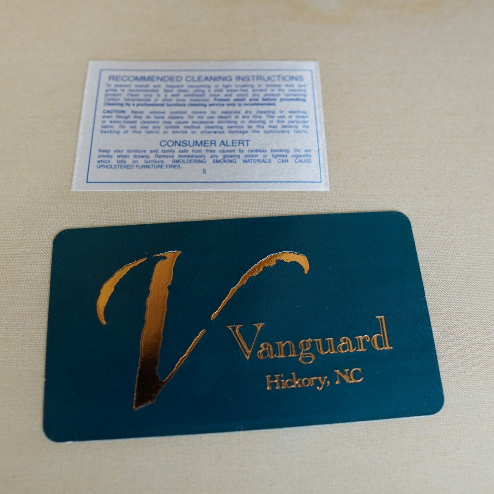 This upholstered sofa by Vanguard Furniture combines refined craftsmanship with a timeless English-inspired profile. The three-cushion design features sloping arms, a tailored back, and turned front legs with brass casters, offering both elegance and comfort. Upholstered in a warm neutral herringbone fabric, the piece reflects Vanguard’s commitment to quality and enduring style. Made in Hickory, North Carolina, and likely produced in the early 2000s or later, this sofa captures the brand’s reputation for classic American-made design.