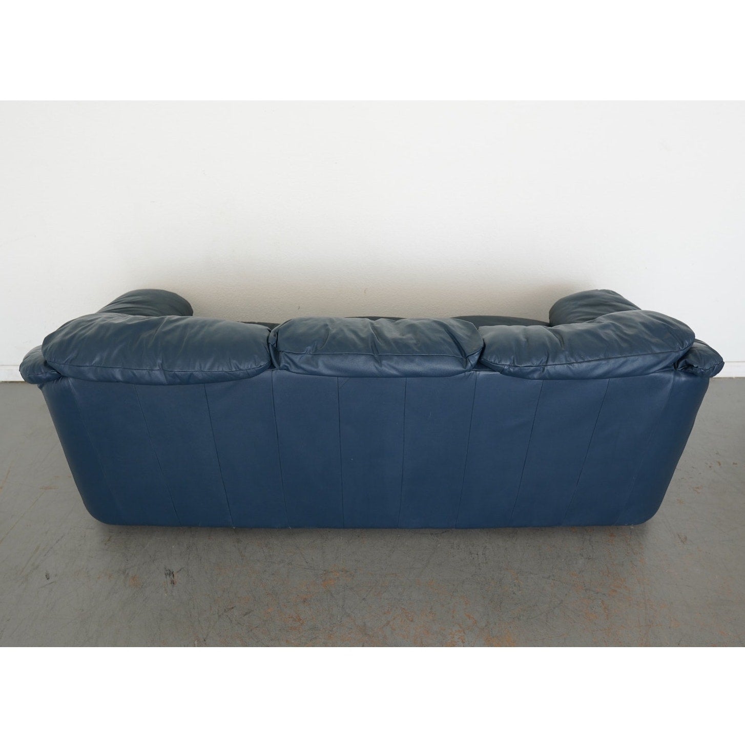 This vintage leather sofa by Viewpoint Leather Works showcases exceptional craftsmanship and timeless design. Upholstered in genuine navy blue aniline-dyed leather, the sofa offers both durability and rich character that comes with age. It features plush, overstuffed cushions for comfort, along with eight-way hand-tied spring coils and a solid hardwood frame, hallmarks of high-quality construction from this era. With its clean lines and deep blue tone, this sofa embodies classic late 20th-century style while offering lasting comfort and support. A true vintage piece, it’s built to stand the test of time and add character to any living space.
